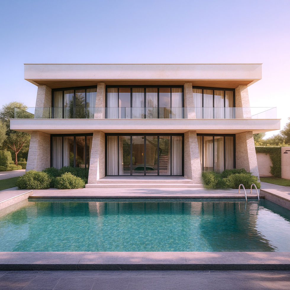 MM Villa is designed with a deliberate angular orientation, opening the entire façade toward the site’s panoramic view and transforming the surrounding landscape into a constant backdrop for daily living. The architectural form is defined by expressive, slightly inclined stone-clad piers that give the villa its dynamic identity while functioning as both structural and aesthetic elements.